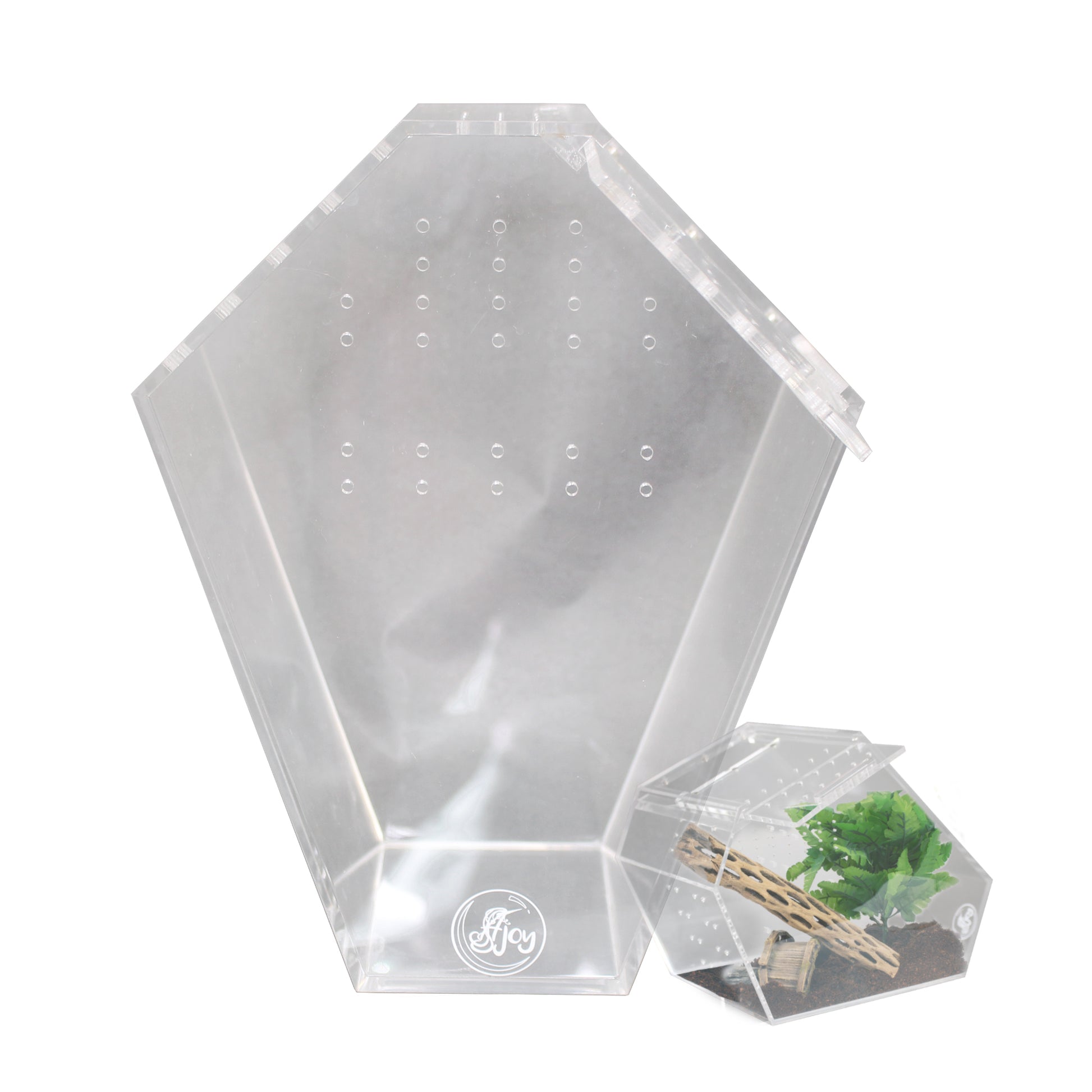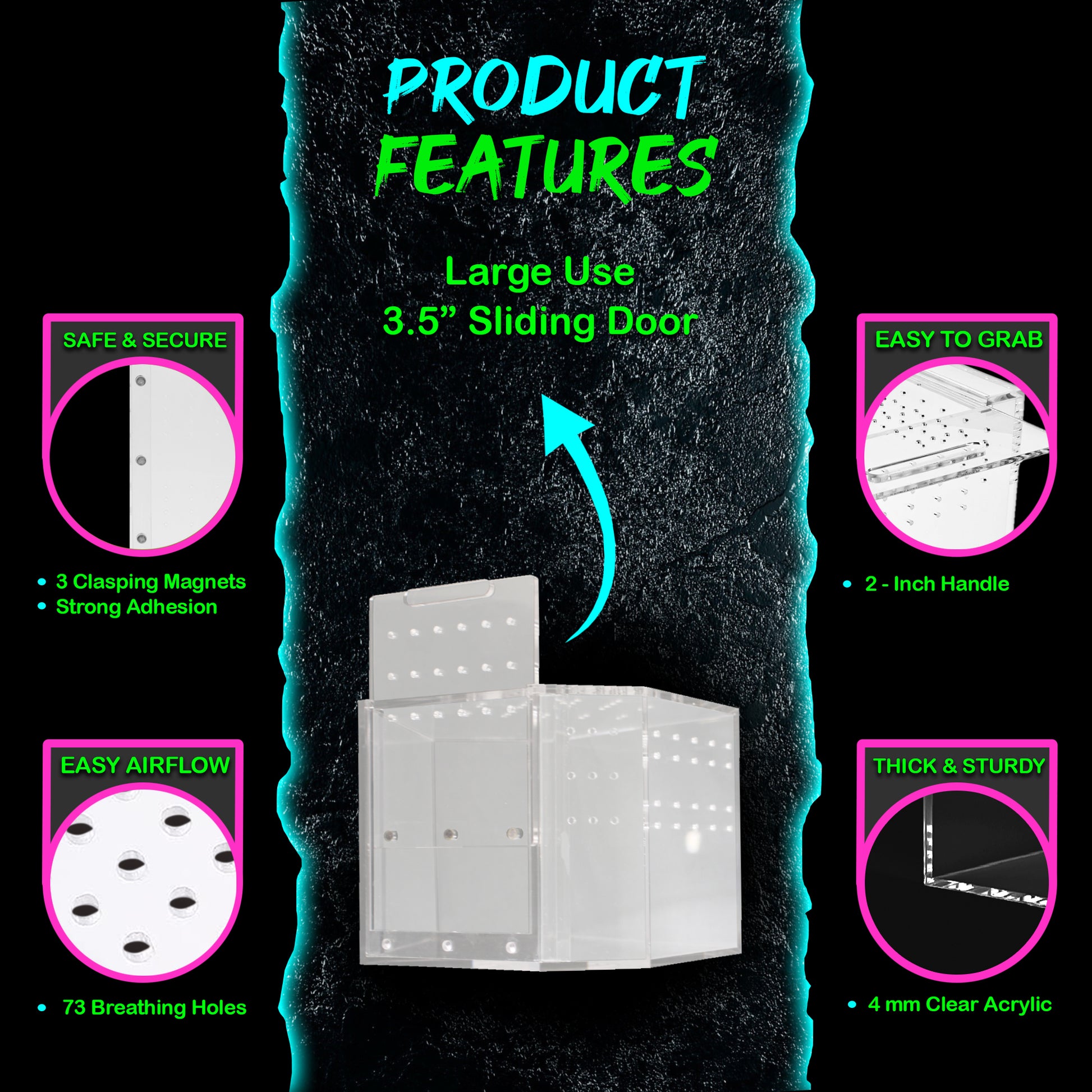 Acrylic Reptile Enclosure: Our terrariums are a crystal clear acrylic box made for 360 degree viewing, offering 4mm thick acrylic walls, making them sturdy. These reptile tanks come equipped with a 3.5” sliding magnetic door and a 2” handle for easy handling along with 3mm holes for ventilation and air circulation.
